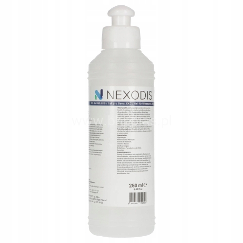 Żel NEXODIS wykonany na bazie wody. Przeznaczony do diagnostyki USG i Doppler. Zapewnia lepszy obraz fal ultrasonograficznych na ekranie, zapobiegając zakłóceniom spowodowanym przepływem powietrza pomiędzy skórą a głowicą urządzenia. Ma doskonały poślizg na skórze. Żel jest bezbarwny i bezzapachowy.