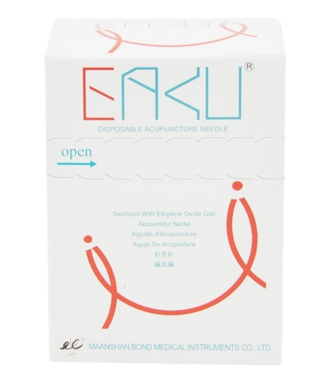 Igły intradermalne do akupunktury marki EAKU wykonano z wysokiej jakości hartowanej stali. Igły zostały sterylnie i hermetycznie zapakowane, są przeznaczone do jednorazowego użytku. Znajdujące się w opakowaniu igły do akupunktury są czyszczone ultrasonicznie aby usunąć jakiekolwiek ślady tłuszczu czy mikroskopijnych nalotów, a następnie sterylizowane tlenkiem etylenu. Pełna automatyka procesu pakowania pozwala uniknąć potencjalnego zanieczyszczenia.