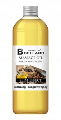 Olejek do masażu rozgrzewający. Olejek został wzbogacony witaminami i ekstraktami ziołowymi, które zostały wybrane i połączone tak, by dawać jak najlepsze efekty poprawy mikrokrążenia w skórze, przez co staje się ona miękka, jędrna i widocznie smuklejsza. Zawiera wyciąg z papryki ostrej, owoców pomarańczy, korzenia imbiru, kory kasztanowca, kory cynamonu, kawy i goździków.
