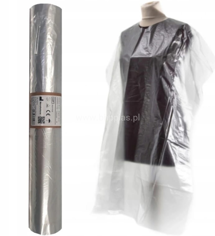 Profesjonalne jednorazowe pelerynki fryzjerskie na rolce z folii bezbarwnej stosowane w salonach fryzjerskich i kosmetycznych.