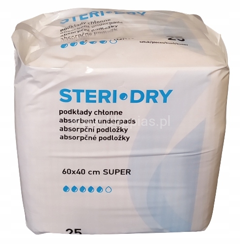 Podkład chłonny STERI DRY 40x60cm jest jednorazowym, niesterylnym, nieinwazyjnym wyrobem medycznym. Polecane są jako ochrona przed wilgocią lub zanieczyszczeniem u osób z nietrzymaniem moczu, u osób częściowo lub trwale unieruchomionych, u kobiet rodzących oraz przy zmianie pieluszek u dorosłych i dzieci.