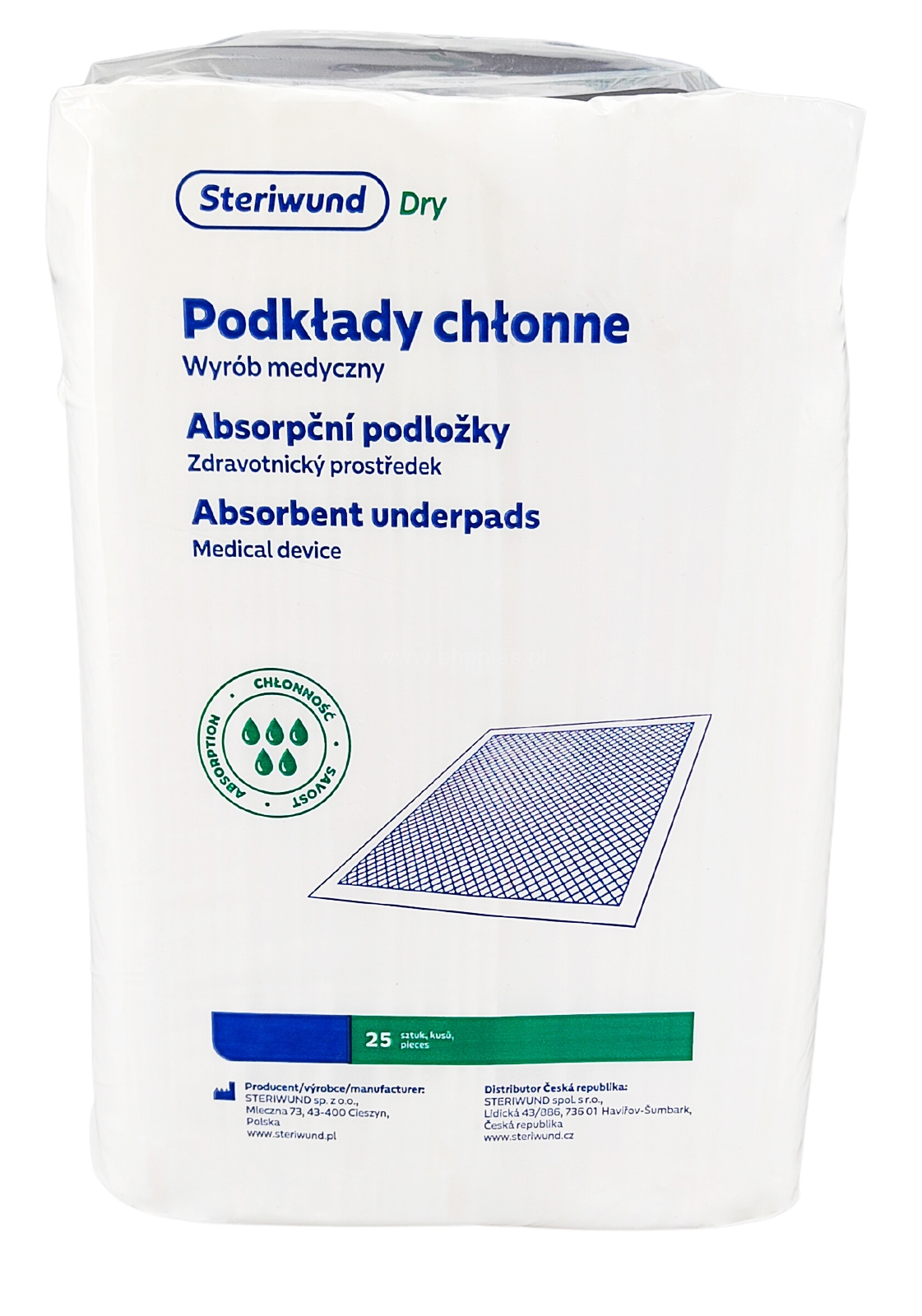 Wkładki chłonne STERI DRY są przeznaczone do ochrony pacjentów, mebli, urządzeń, w tym łóżek, materacy i pościeli, do wchłaniania lekkich i średnich płynów ustrojowych spowodowanych przez nietrzymanie moczu, podczas zabiegów medycznych, opiekuńczych, pielęgnacyjnych lub karmienia.